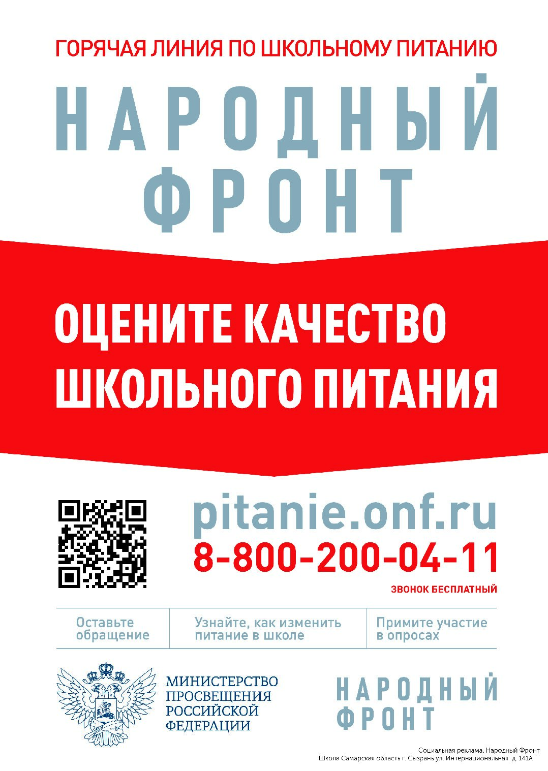 Фондом «Бюро расследований ОБЩЕРОССИЙСКОГО НАРОДНОГО ФРОНТА» организовала горячая линия «Школьный завтрак» для контроля качества питания. Для каждой образовательной организации разработан индивидуальный плакат с QR-кодом